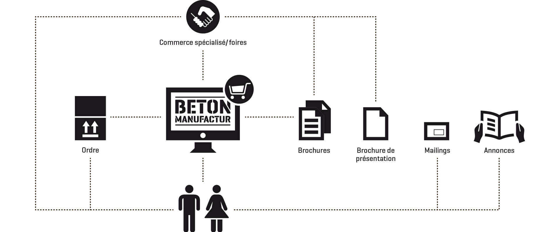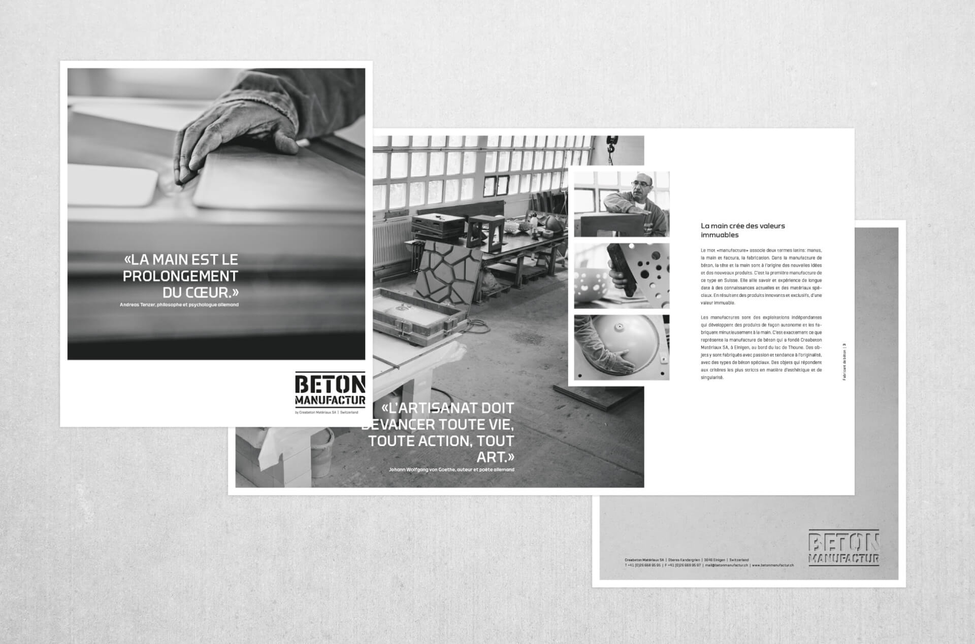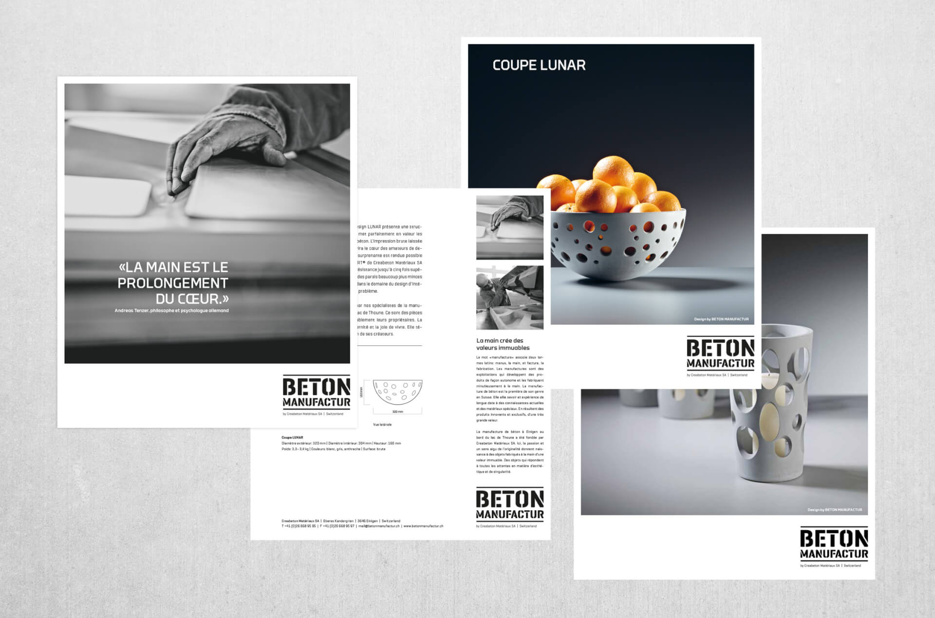 La marque «Beton Manufactur» nouvellement créée se devait de recevoir une image distinctive. Le nouveau label s’adresse au monde de puristes des architectes. Il s’agissait ici de les convaincre tant du caractère brut et industriel du matériau béton que de la possibilité de réaliser des formes filigranes grâce à des procédés récemment développés.