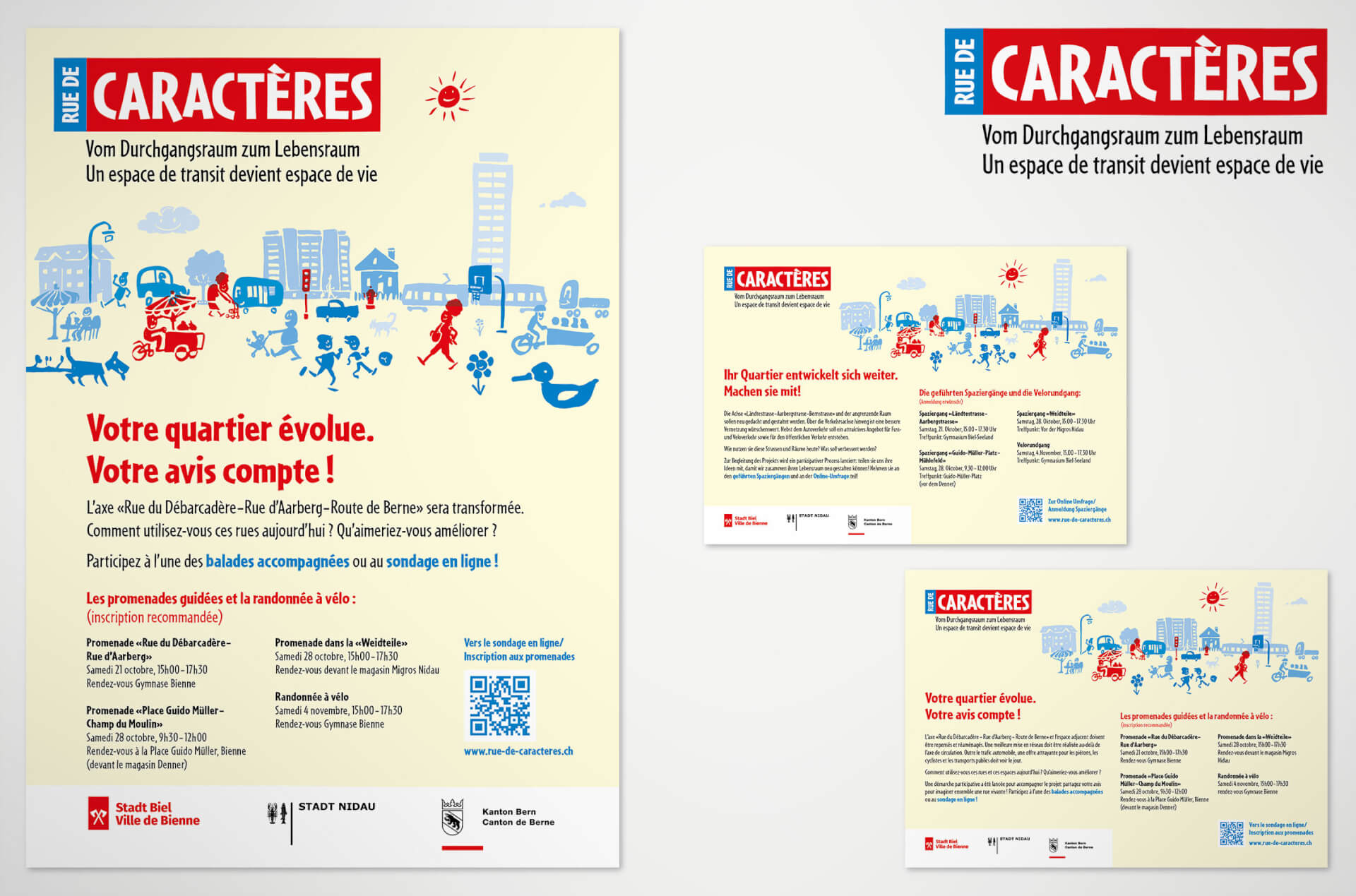 Le fil conducteur est assuré sous la forme d’une présentation uniforme dans le style des illustrations. Le nom choisi pour le projet est « Rue de Caractères ». Nous avons lancé un site web pour regrouper toutes les activités et informations relatives au projet. Pour motiver la population, nous utilisons des tours d’information, des panneaux d’affichage ainsi que l’envoi de flyers aux ménages de la région concernée. L’implication de toutes les personnes intéressées s’est faite par le biais de diverses promenades accompagnées et des enquêtes concrètes sur les besoins de la population. L’information sur l’état d’avancement du projet et les activités à venir a été assurée par une newsletter envoyée périodiquement.