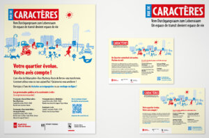 Le fil conducteur est assuré sous la forme d’une présentation uniforme dans le style des illustrations. Le nom choisi pour le projet est « Rue de Caractères ». Nous avons lancé un site web pour regrouper toutes les activités et informations relatives au projet. Pour motiver la population, nous utilisons des tours d’information, des panneaux d’affichage ainsi que l’envoi de flyers aux ménages de la région concernée. L’implication de toutes les personnes intéressées s’est faite par le biais de diverses promenades accompagnées et des enquêtes concrètes sur les besoins de la population. L’information sur l’état d’avancement du projet et les activités à venir a été assurée par une newsletter envoyée périodiquement.