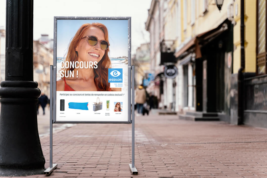 Selon le cahier des charges d’Essilor Suisse, une campagne estivale devait être élaborée pour aider les magasins d’opticiens à faire parler d’eux après le confinement et inciter les clients à se rendre dans les magasins spécialisés. Il fallait pour ce faire développer une campagne qui diffuse une ambiance estivale positive et récompense les clients avec des avantages, des concours et des cadeaux.